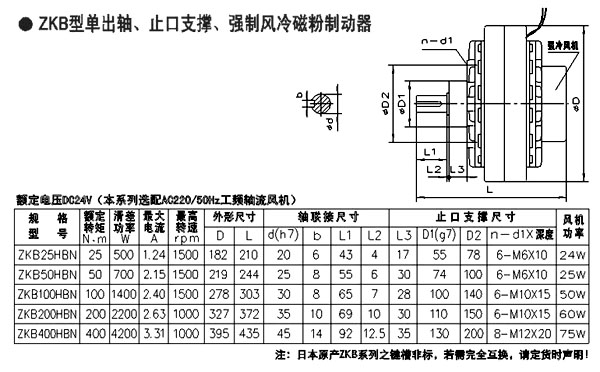 ZKB型單出軸止口支撐強制風冷磁粉制動器型號標準參照日本三菱電機ZKB-AN和ZKB-BN型產品,晨港機電ZKB型磁粉制動器產品和日本原裝產品的安裝尺寸上可以互換,在性能使用上可以替代日本原裝產品。