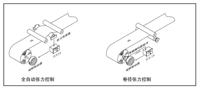 KTC83全自動與卷徑張力控制器8可以設置為全自動張力控制器或卷徑張力控制器,當功能選擇[28] m設置允自動張力控制時,KTC838為全自動張力控制器,需安裝張力傳感器組成閉壞控制系統(tǒng)。當功能選擇[28]設置為卷徑張力控制時,KTC838為卷徑張力控制器,只需安裝接近開關(guān)/編碼器對料卷半徑進行測S,控制器根據(jù)卷徑進行張力控制。